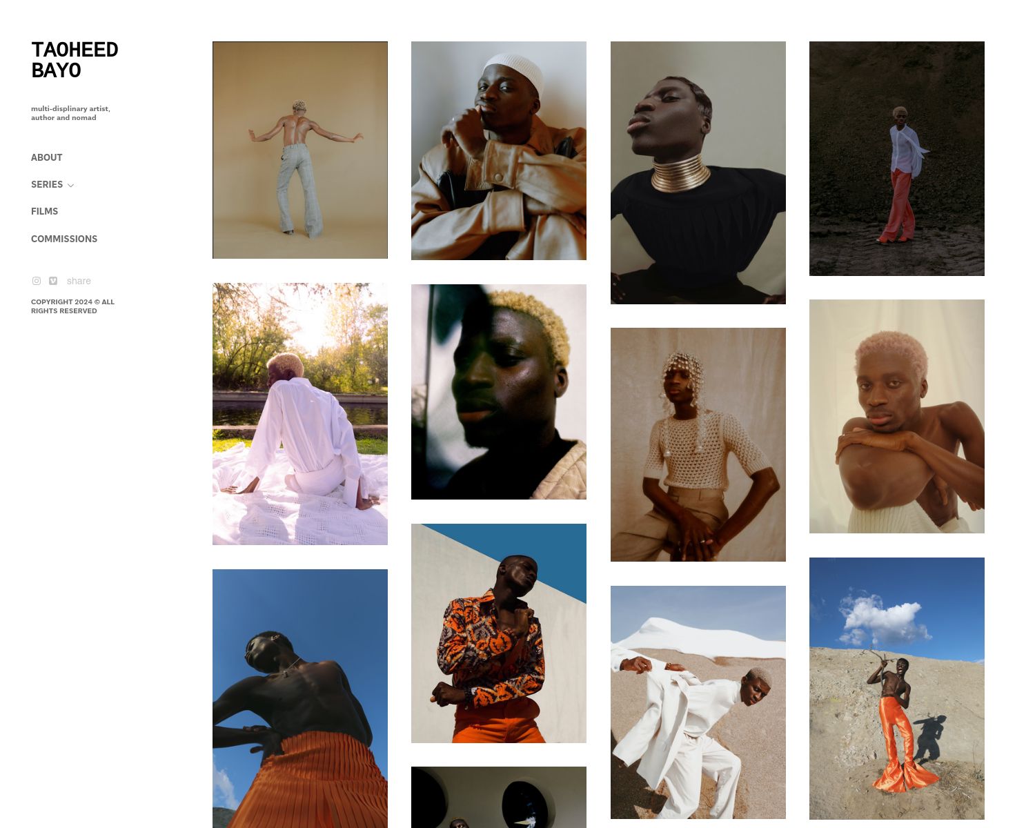 Taoheed's modeling portfolio is a great example of how to add a diverse range of shots front and center. It's clear from the editorial shots he's included that he's familiar with many types of modeling, a versatility that is applauded by many in the fashion industry.